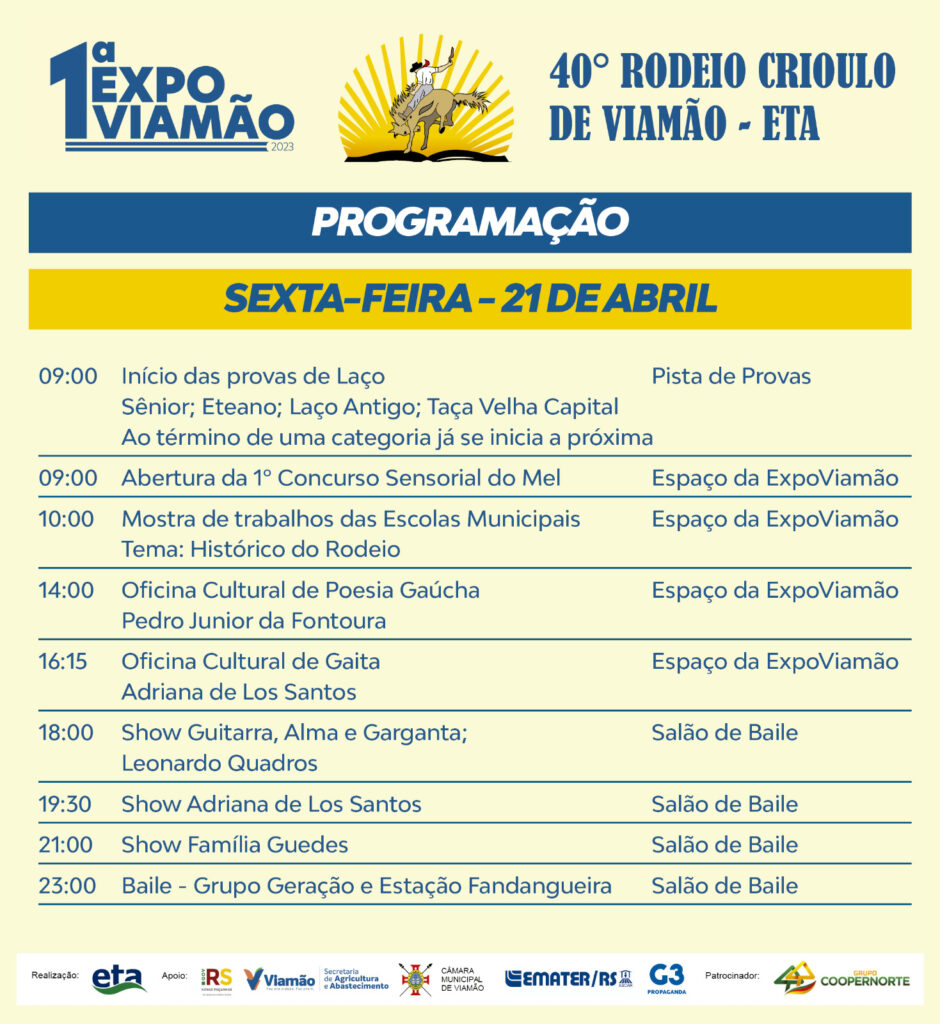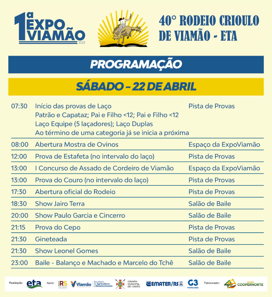 Conforme informações da Prefeitura, na próxima quinta-feira (20), começa o 40º Rodeio Crioulo de Viamão, realizado no Parque Bento Gonçalves, na Escola Técnica de Agricultura - ETA, com provas campeiras e atrações culturais. Nesta edição comemorativa de 40 anos, além das provas e shows, haverá a I EXPOVIAMÃO, uma feira agropecuária com oficinas temáticas de horticultura, irrigação e de criações.