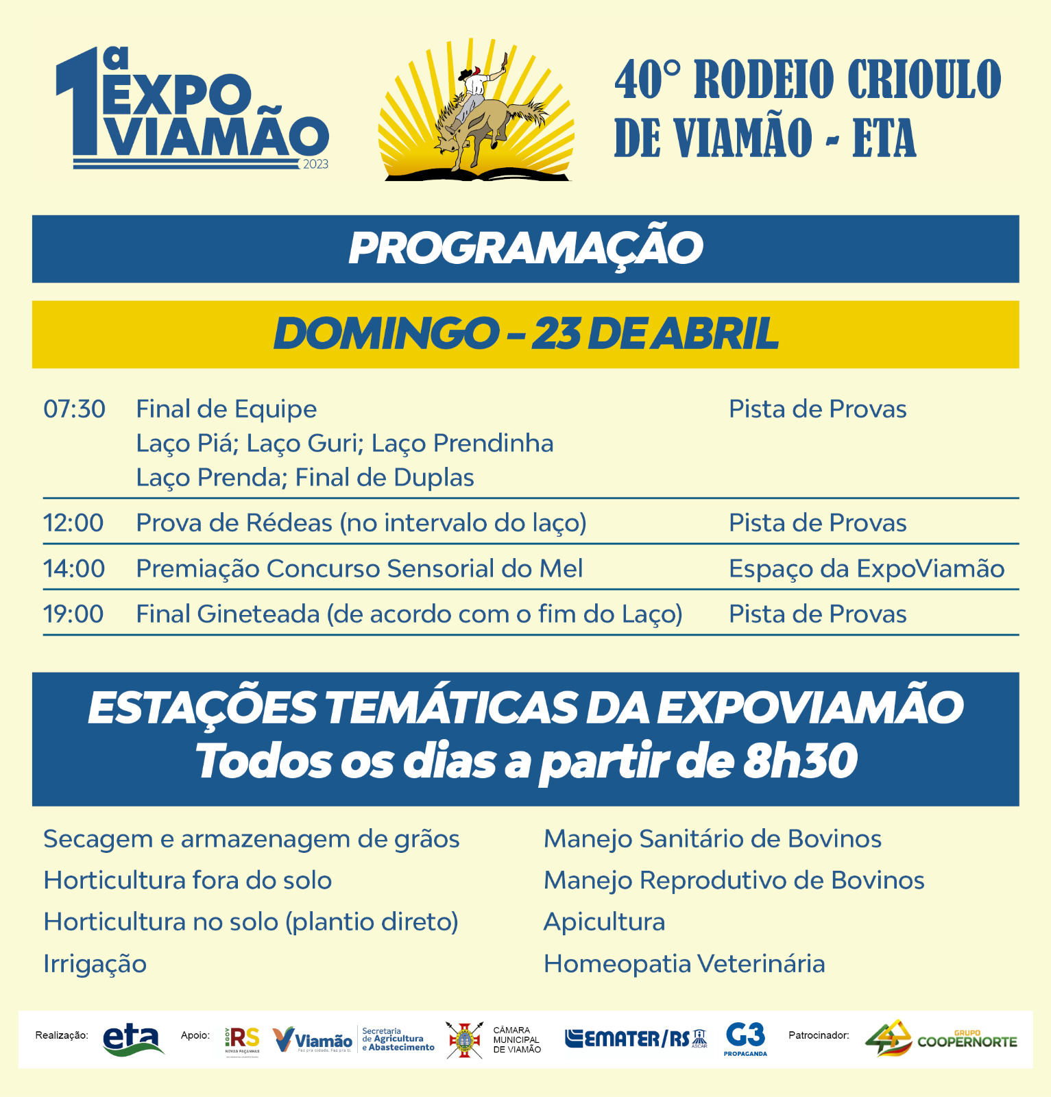 A realização é da Prefeitura de Viamão e da Escola Técnica de Agricultura - ETA, com apoio do Governo do Estado, Emater, Câmara de Vereadores e G3 Propaganda e patrocínio da Coopernorte.