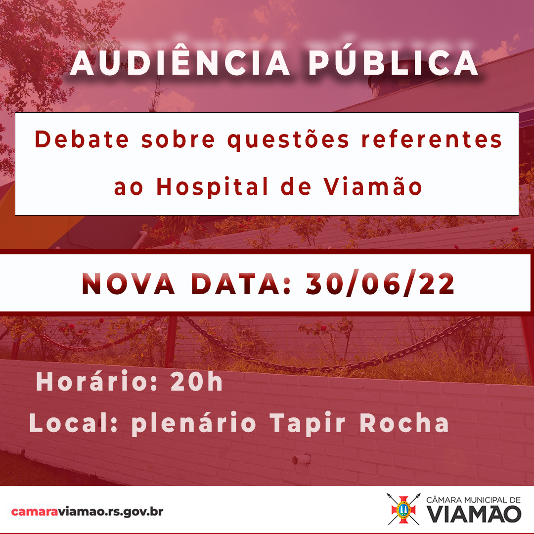 A audiência pública que estava prevista para o dia 09 de junho para debater questões relacionadas ao atendimento do Hospital Viamão foi transferida para o dia 30 de junho de 2022, a partir das 18h, no plenário Tapir Rocha. A nova data foi estabelecida na 32ª sessão ordinária da CMV, no último dia 07.