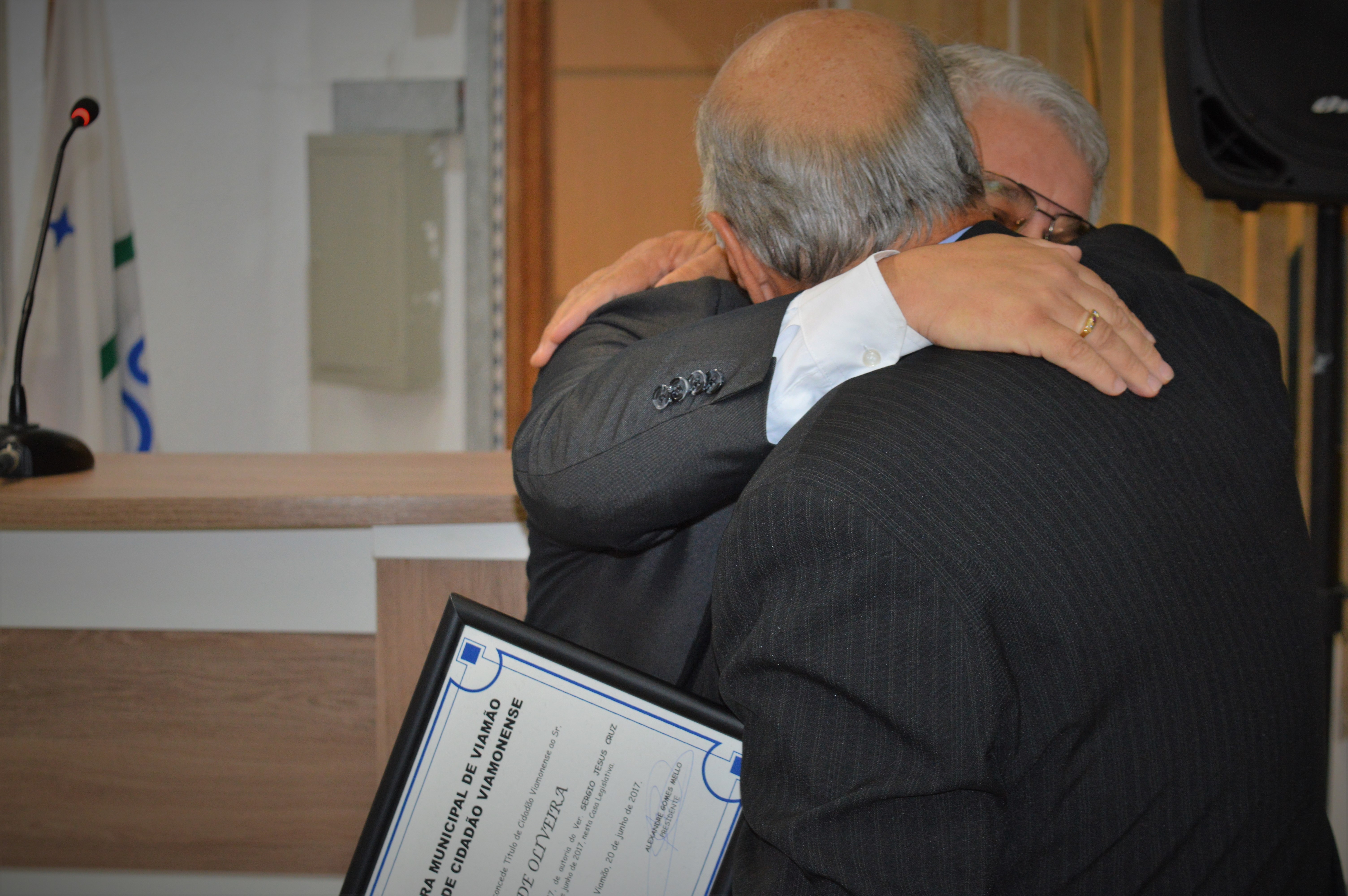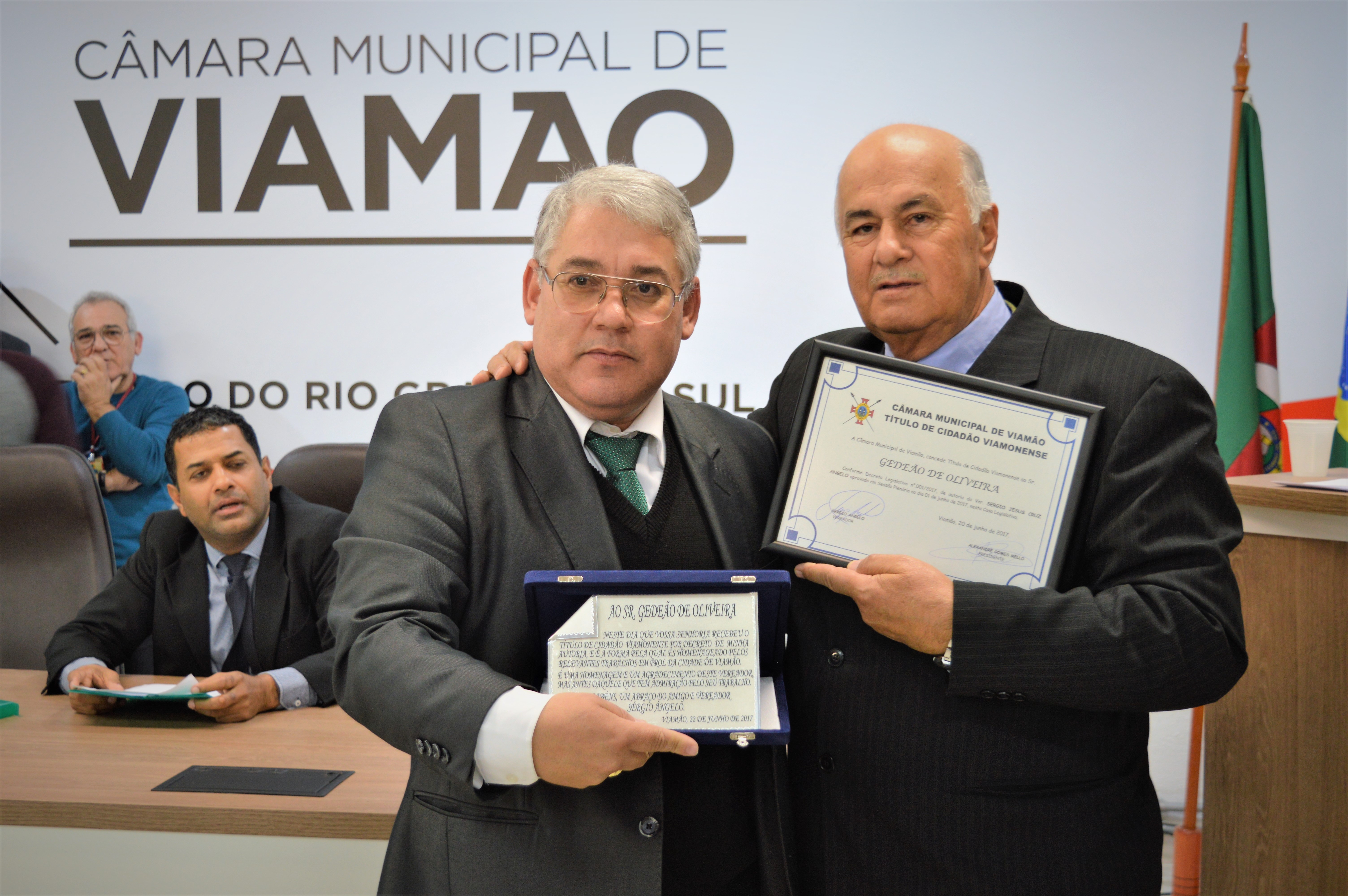 Nesta quinta-feira (22), a Câmara de Viamão concedeu o título de cidadão viamonense a Gedeão de Oliveira, em reconhecimento pelos serviços e atitudes civis, comerciais e religiosos na cidade. A iniciativa foi do vereador Sérgio Ângelo – PV, que se emocionou na tribuna ao falar do homenageado.