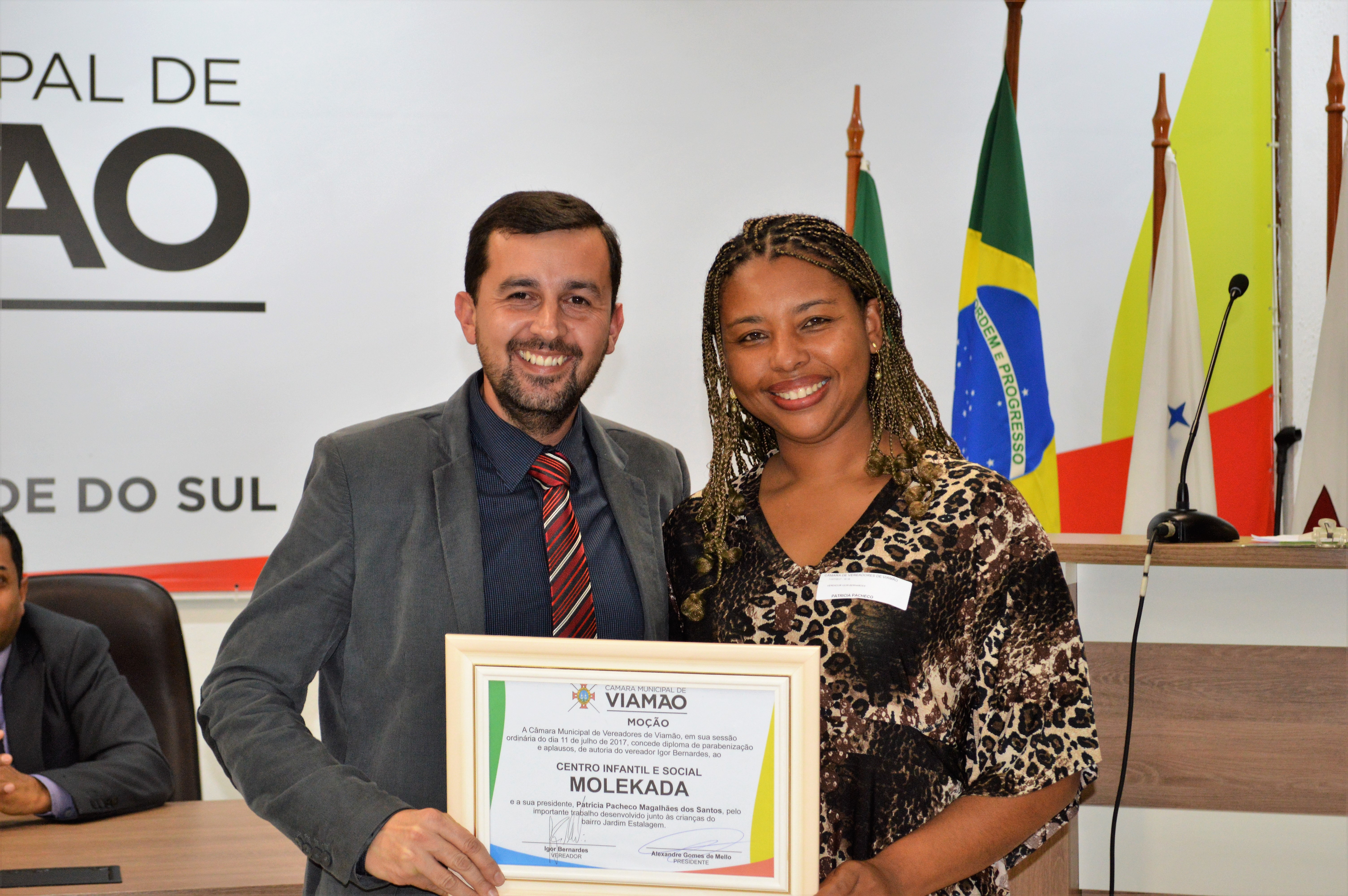 Por iniciativa do vereador Igor Bernardes – PPS, a Câmara de Viamão prestou uma homenagem ao Centro Infantil e Social Molekada, que atende crianças no Jardim Estalagem. A presidente da entidade, Patrícia Pacheco Magalhães dos Santos recebeu uma Moção de Reconhecimento, nesta terça-feira (11).