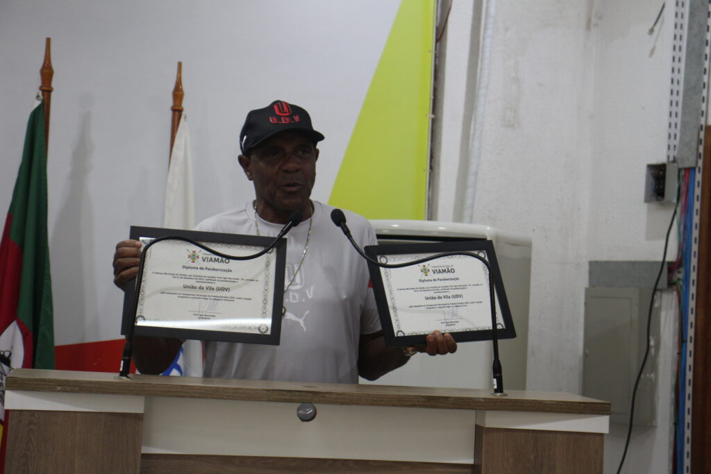 A equipe União da Vila (UDV) recebeu das mãos do presidente da Câmara de Vereadores, Prof. Igor Bernardes - PL, duas homenagens, referentes à sua participação no Campeonato Municipal de Futebol Amador 2022. O time do bairro da Santa Isabel foi finalista em duas categorias, garantindo o vice na categoria Livre e conquistando o troféu na categoria Veteranos. O treinador da categoria Veterano Jorge "Baleia" recebeu os diplomas de parabenização na sessão plenária de hoje (21), no plenário Tapir Rocha.