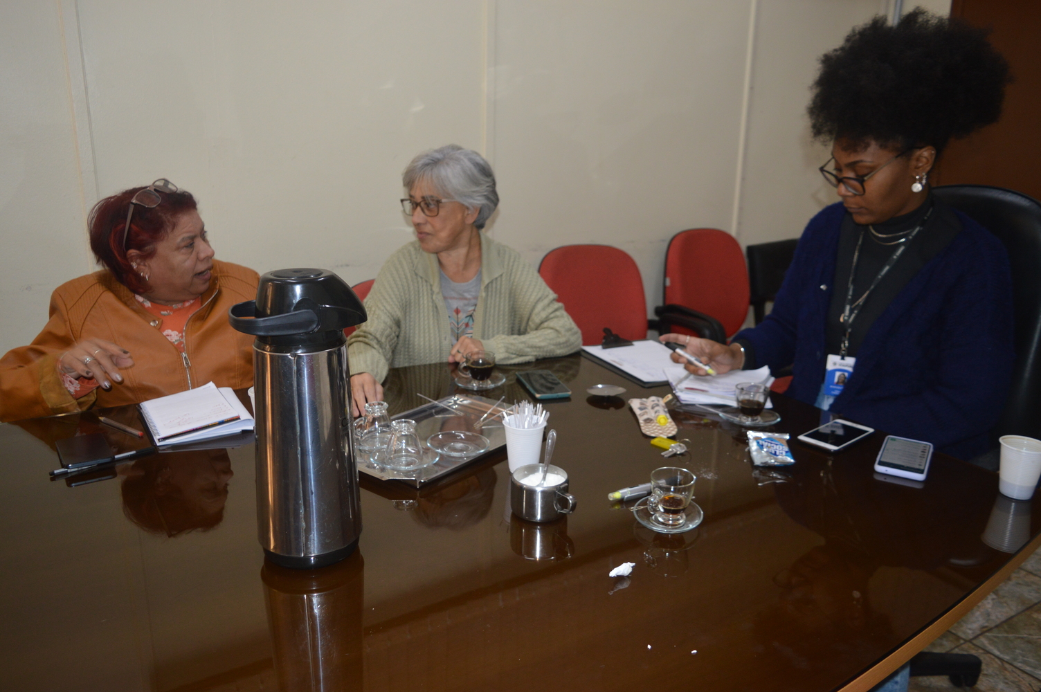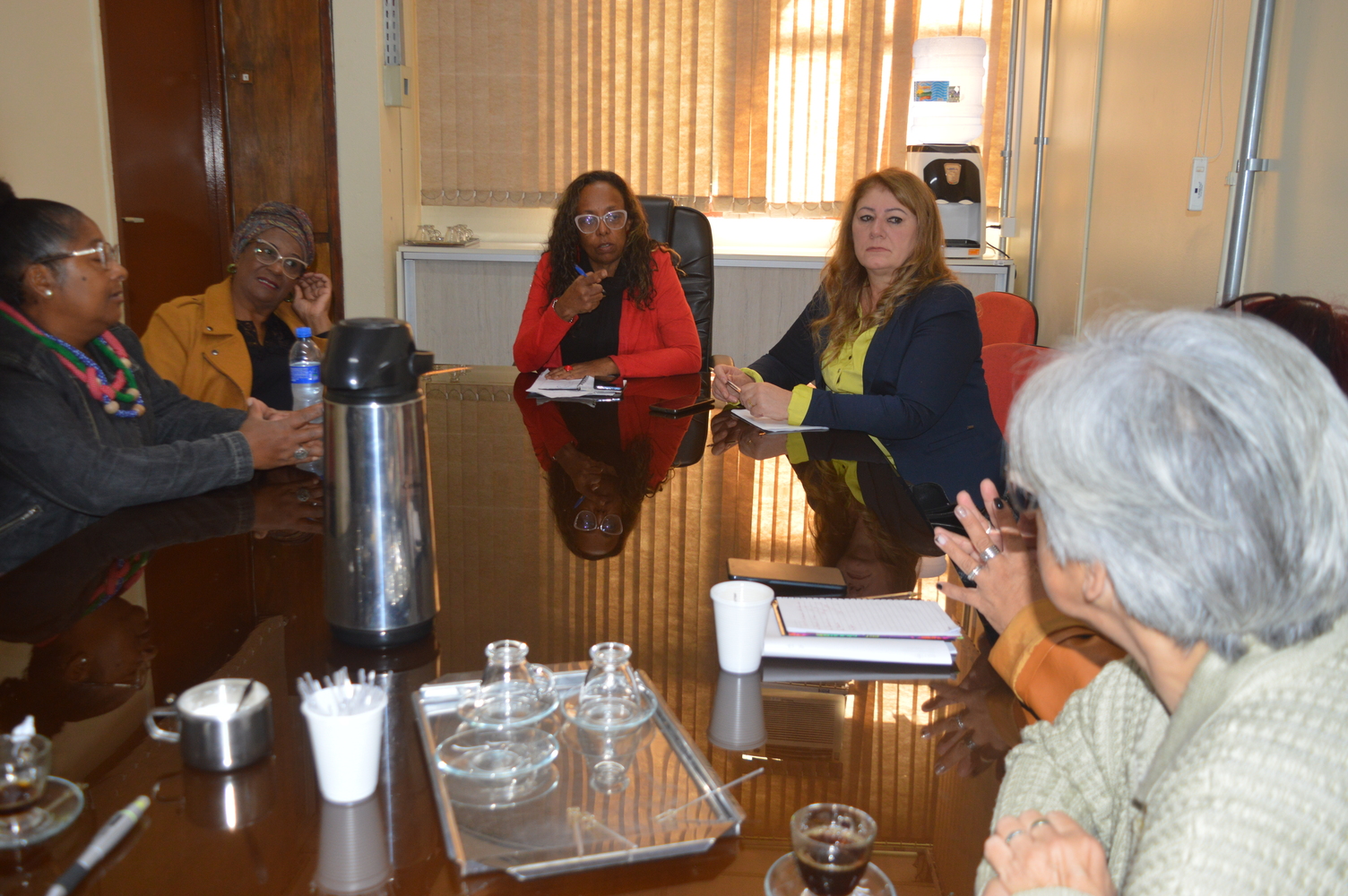 Estiveram presentes, no encontro desta quinta-feira, a representante do Fórum de Mulheres, Maria Darcila Tinoco; a presidente do Conselho Municipal dos Direitos da Mulher do Município de Viamão – COMDIM, Denise Nunes; a representante do COMDIM, Nair Dutra; e a secretária de Mulheres do PT Viamão, Maria Bolico.