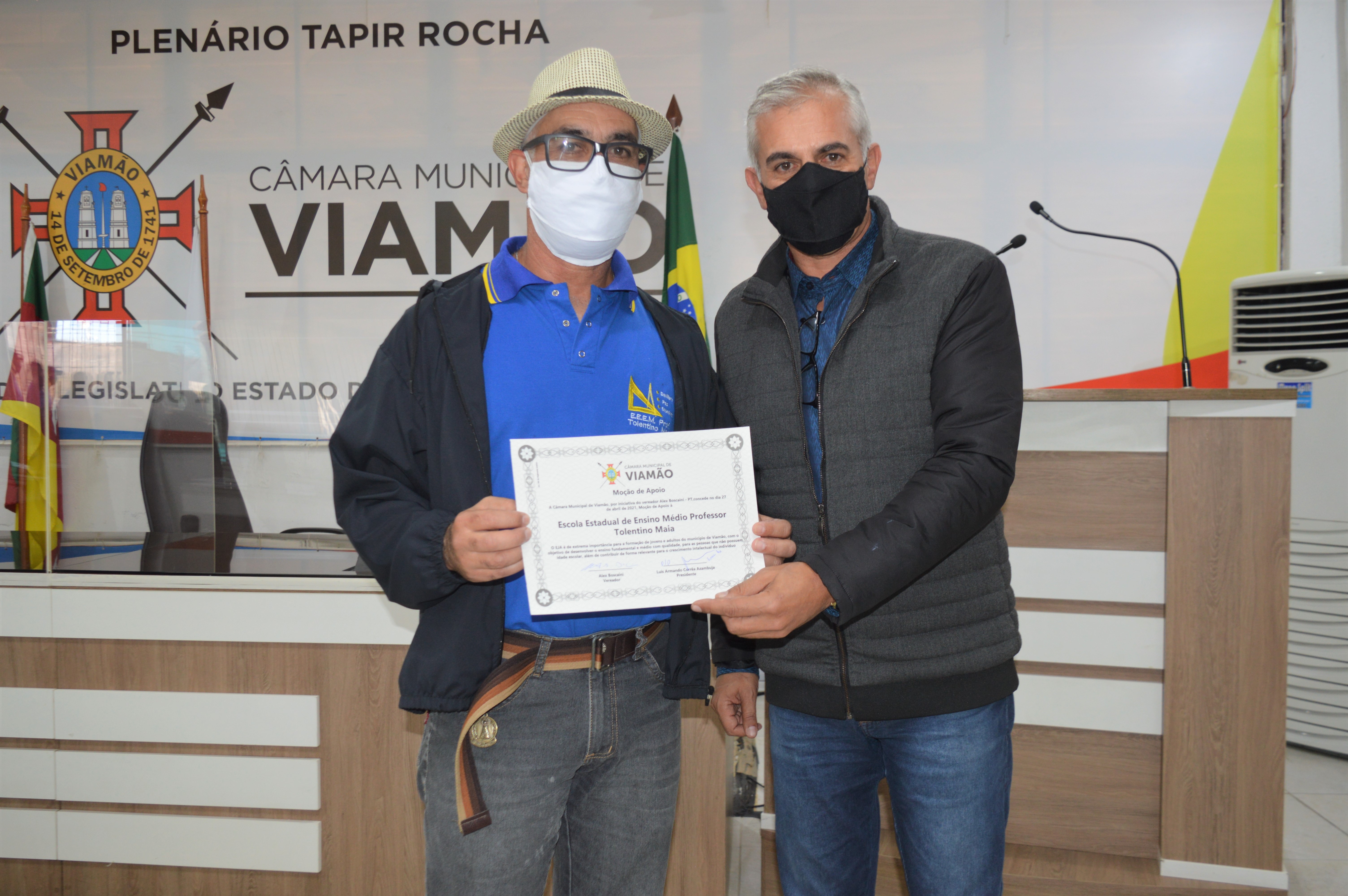 A Comissão de Educação da Câmara Municipal de Viamão – CMV, composta pelos vereadores Alex Boscaini – PT, Igor Bernardes – PL e Keno do Jari – PSDB, entregou moção de apoio à Escola Estadual de Ensino Médio Professor Tolentino Maia para a manutenção das atividades do EJA - Educação para Jovens e Adultos, tendo em vista o possível encerramento das mesmas de acordo com audiência pública do Estado para proibir a abertura de novas turmas em 2021. A entrega foi realizada na tarde desta terça-feira (27), no plenário Tapir Rocha, ao diretor da escola, Glênio Andrade.