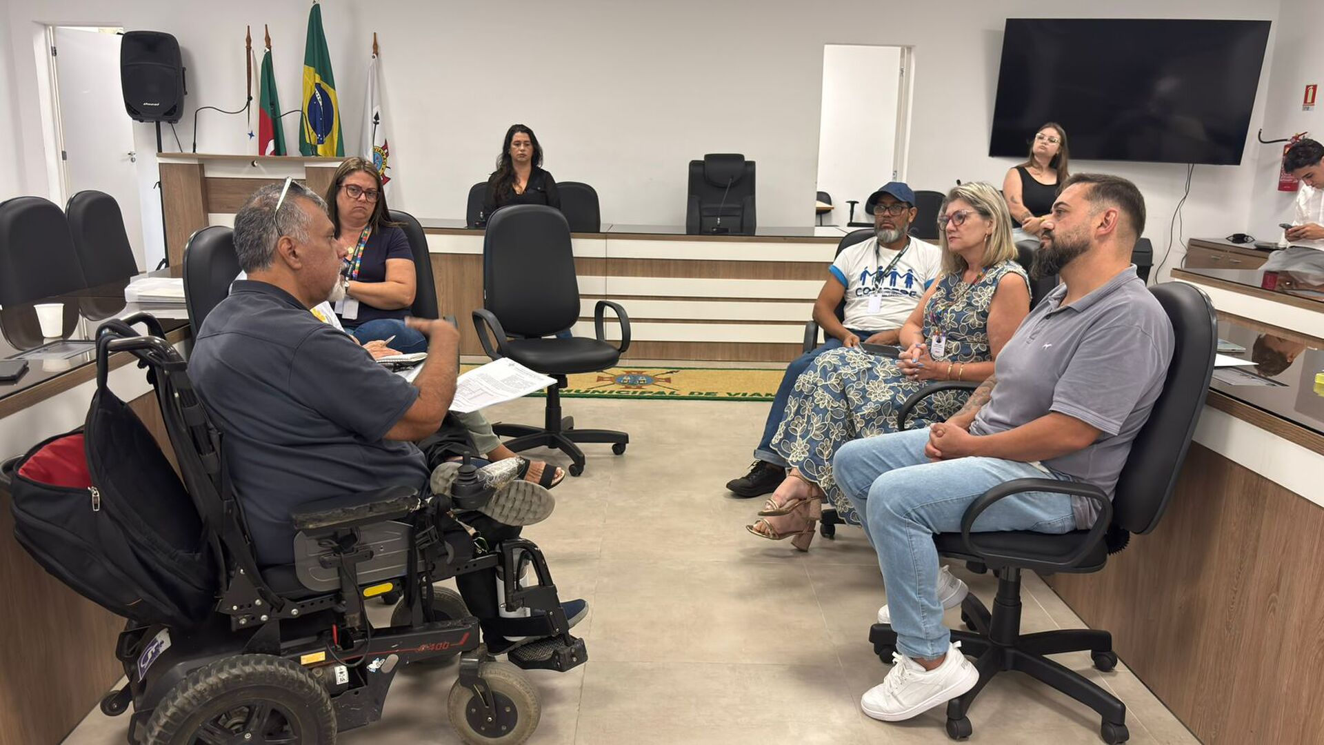 Na manhã desta terça-feira (31), o Conselho Municipal dos Direitos da Pessoa com Deficiência – Compede, presidido por Dilceu Júnior, realizou sua reunião plenária mensal na Câmara Municipal de Viamão – CMV. A secretária de Educação, Marcia Culau, esteve presente no encontro, onde apresentou o projeto de lei 28/2026, de autoria do Poder Executivo, que busca a contratação temporária de profissionais para a rede municipal de ensino, auxiliando na Educação Especial. A referida proposição está em tramitação na Casa Legislativa e, posteriormente, será apreciada e votada em sessão plenária. Também compareceu à reunião o vereador Plínio Konig – PSDB e a assessoria do gabinete do vereador Lucianinho – União Brasil.