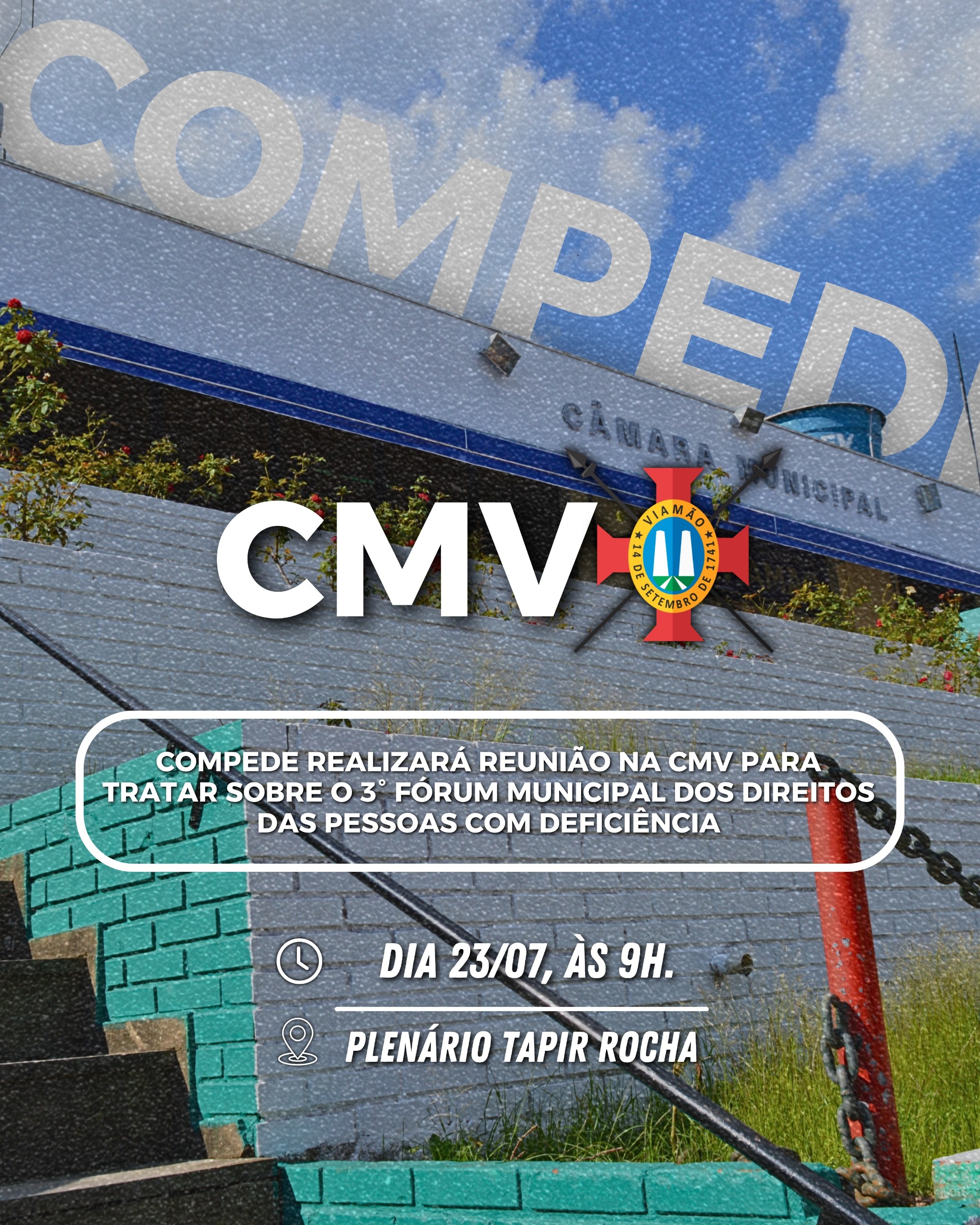 O Conselho Municipal dos Direitos da Pessoa com Deficiência de Viamão – Compede realizará reunião na quarta-feira (23), às 9h, na Câmara Municipal de Viamão – CMV, para tratar sobre o 3° Fórum Municipal dos Direitos das Pessoas com Deficiência, cujo tema a ser trabalhado neste ano é acessibilidade urbana. O referido Fórum será realizado no dia 23 de agosto de 2025, das 8h às 12h, no Hall da CUFA, localizado na Avenida Senador Salgado Filho, 2055 – Parada 36, bairro Cecília.