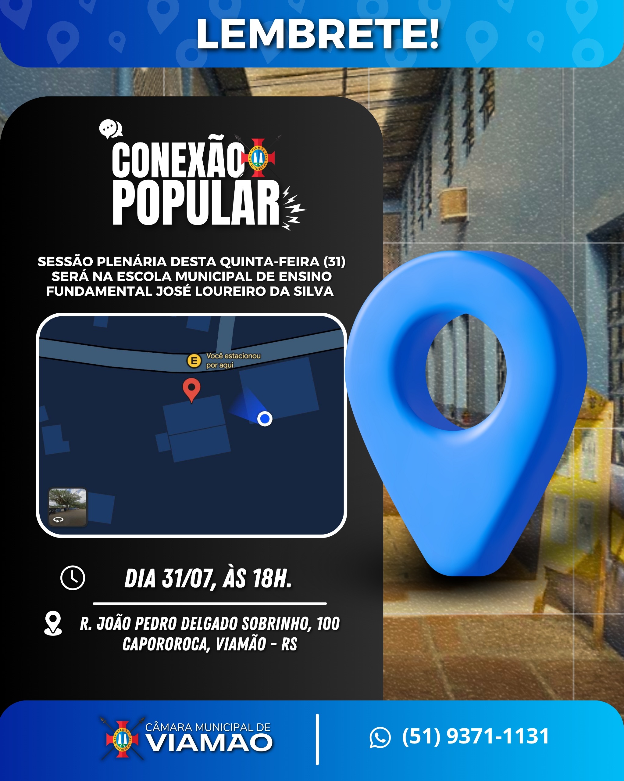 Nesta quinta-feira, 31 de julho, a Câmara Municipal de Viamão promoverá mais uma sessão ordinária fora de sua sede, como parte do projeto Conexão Popular. A sessão acontecerá às 18h, nas dependências da Escola Municipal José Loureiro da Silva, localizada na Rua João Pedro Delgado Sobrinho, nº 100, no bairro Capororoca.