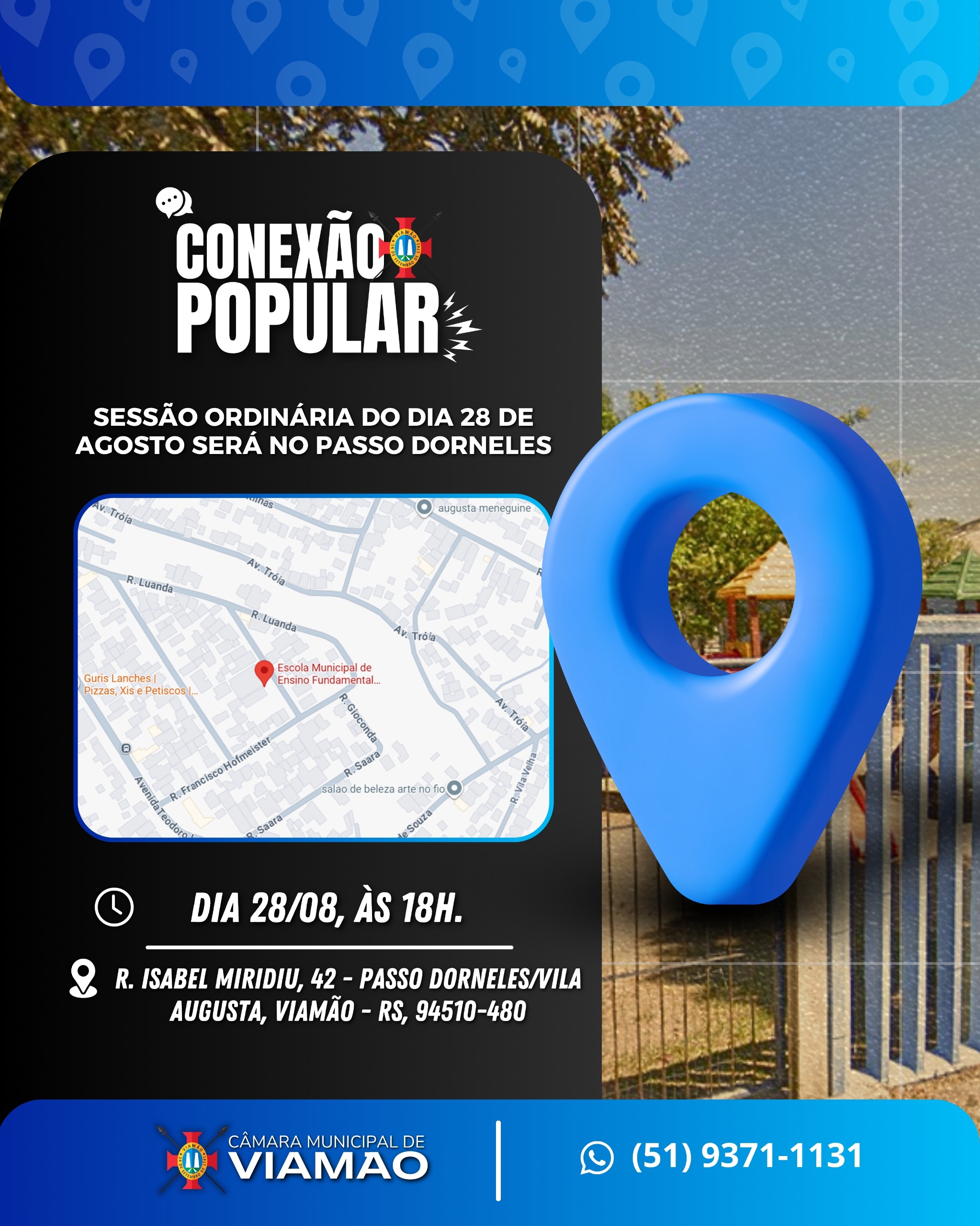 A terceira edição do programa Conexão Popular será realizada na quinta-feira, dia 28 de agosto de 2025, a partir das 18h, com a realização da sessão ordinária da Câmara Municipal de Viamão – CMV na Escola Municipal de Ensino Fundamental Lauro Pereira Rodrigues, situada na Rua Isabel Miridiu, nº 42, no Passo Dorneles, localizado na Vila Augusta, em Viamão. A iniciativa busca estreitar os laços entre o Poder Legislativo e a população, por meio da realização de sessões plenárias em diferentes localidades do município, promovendo o engajamento e a participação ativa da comunidade nos processos democráticos.