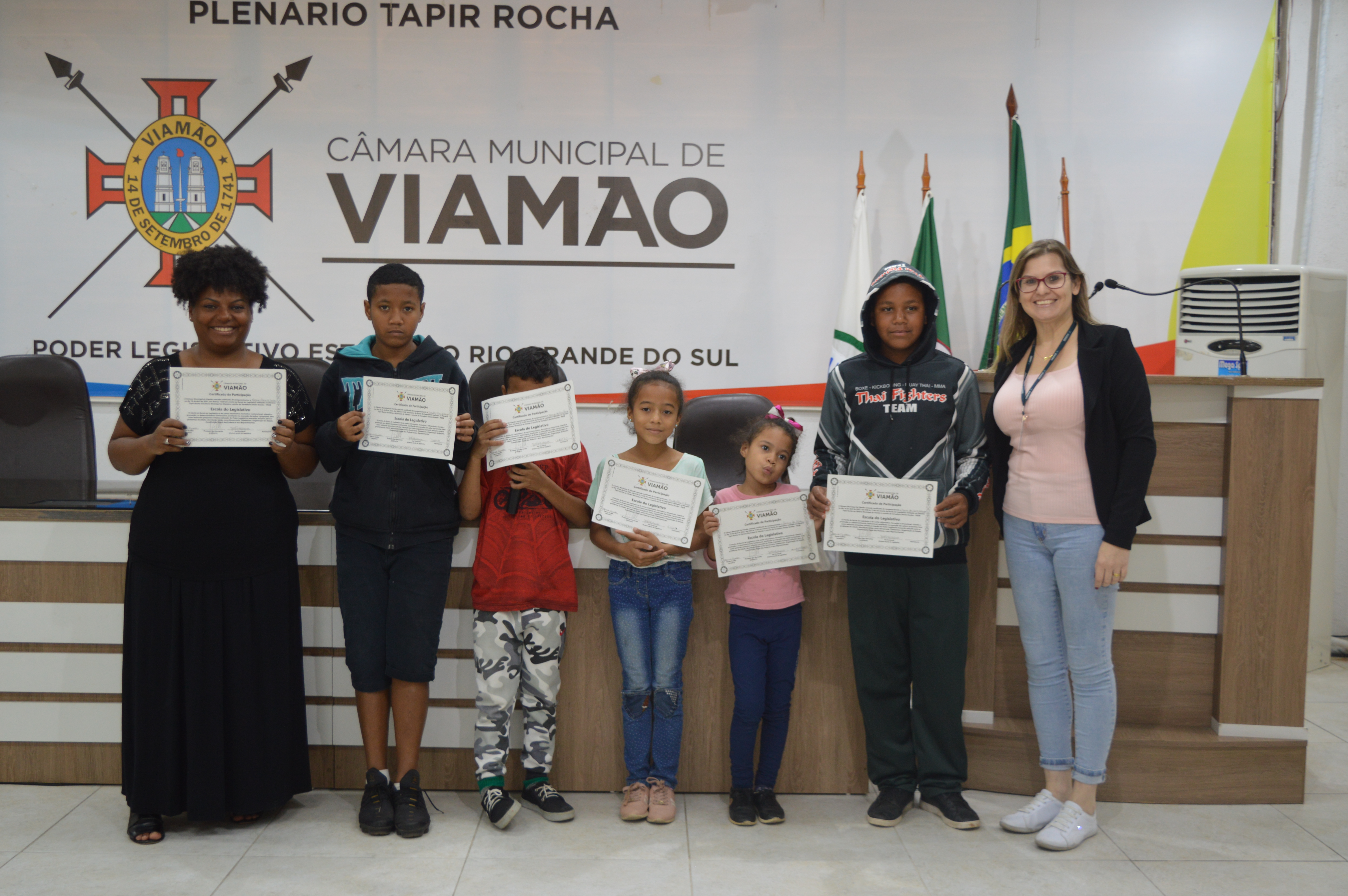 Na manhã desta terça-feira (19), na Câmara Municipal de Viamão - CMV, aconteceu a primeira edição do ano de 2022 da Escola do Legislativo, projeto criado na Legislatura de 2018. O encontro reuniu cinco crianças do CRAS Monte Alegre. A vereadora Denise Guedes - PSDB recebeu os alunos, fez a entrega de certificados, explicou o funcionamento da Câmara, indagou os pequenos sobre quais leis fariam se fossem vereadores por um dia.