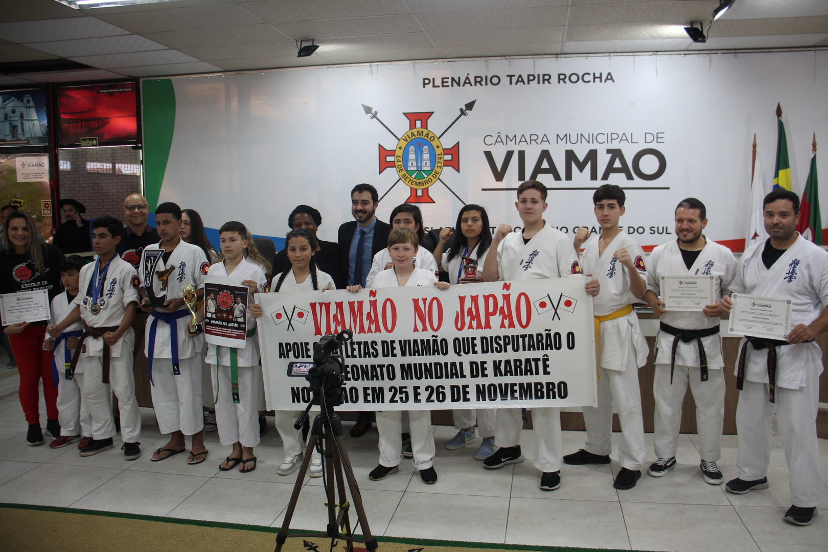 Os atletas Renan Dorneles e Cristiano Santos representarão o Brasil e o município de Viamão no Campeonato Mundial de Artes Marciais que ocorrerá no Japão, nos dias 25 e 26 de novembro deste ano. O atleta Claudio da Silva Jr. subiu à tribuna para agradecer a homenagem feita à Entidade Dojo Três Figueiras, contou sobre sua trajetória no Karatê e enfatizou o potencial de transformação que o esporte de Artes Marciais tem na vida das pessoas que o praticam.