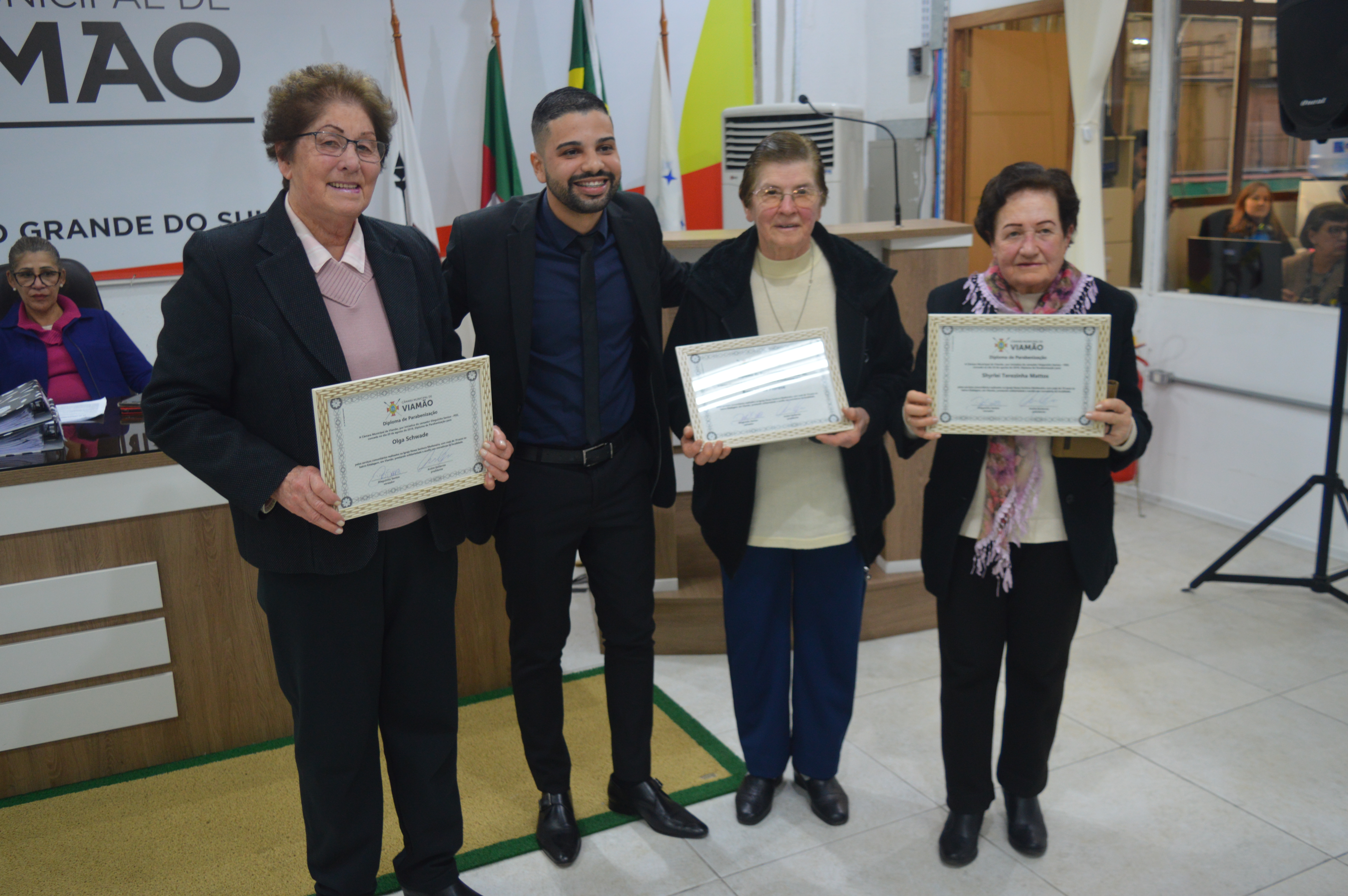 O vereador Dieguinho Santos – PSD homenageou as irmãs Olga Schwade, Rosa Linda Fiorese e Shyrlei Terezinha Mattos pela prestação de serviços comunitários na Igreja Nossa Senhora Medianeira. A entrega de diploma de parabenização aconteceu na sessão desta terça-feira (20), na Câmara Municipal de Viamão - CMV.