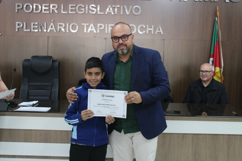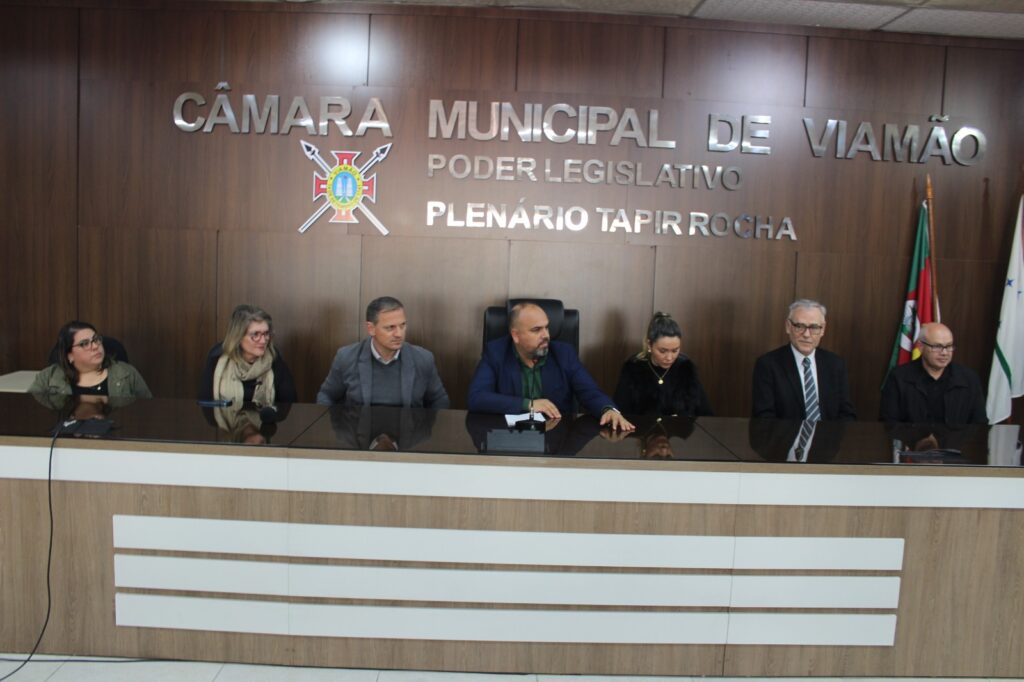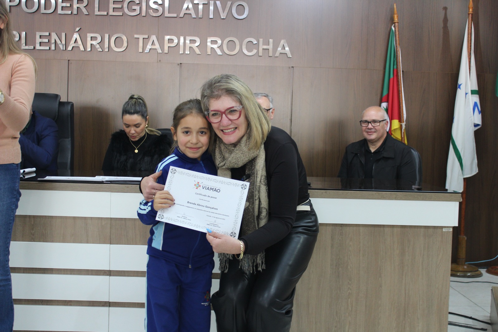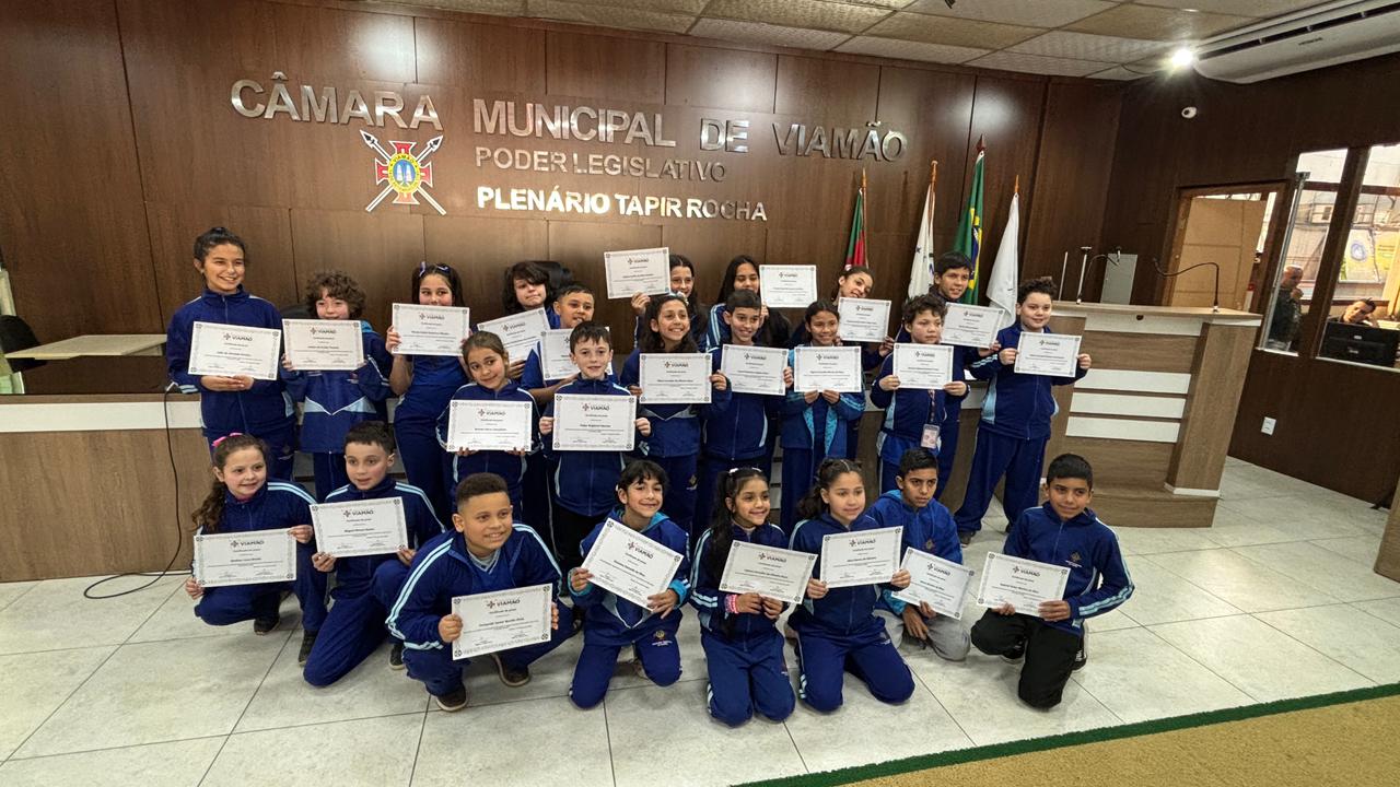A Câmara Municipal de Viamão – CMV realizou mais uma edição da Escola do Legislativo na tarde da última quarta-feira (13), no plenário Tapir Rocha, reunindo 27 crianças do 3º, 4º e 5º anos da Escola Municipal de Ensino Fundamental – EMEF Glênio Peres. Estiveram presentes no evento, a diretora Mariana da Silva Veloso, a coordenadora Karen Juliana Silva da Silva e a professora Susaine Malta de Sá.