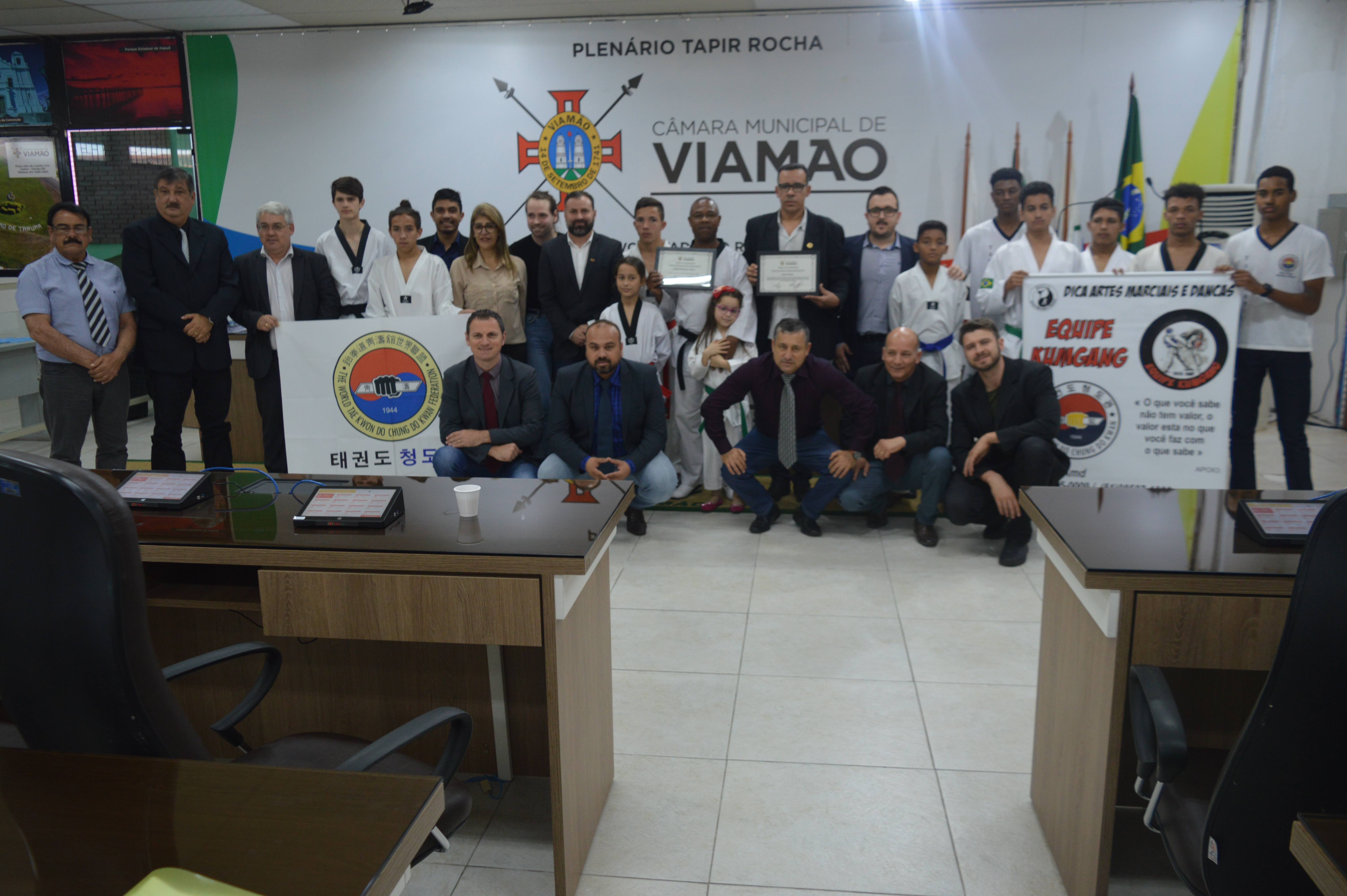 O vereador Guto Lopes – PSOL entregou diploma de parabenização para o mestre Cezar Nunez, por ter conquistado o 9º Dan de Taekwondo, e Claudir Monteiro Olmes pelo trabalho desenvolvido na vila Elsa com o Taekwondo. A homenagem aconteceu na sessão desta quinta-feira (26), na Câmara Municipal de Viamão – CMV.