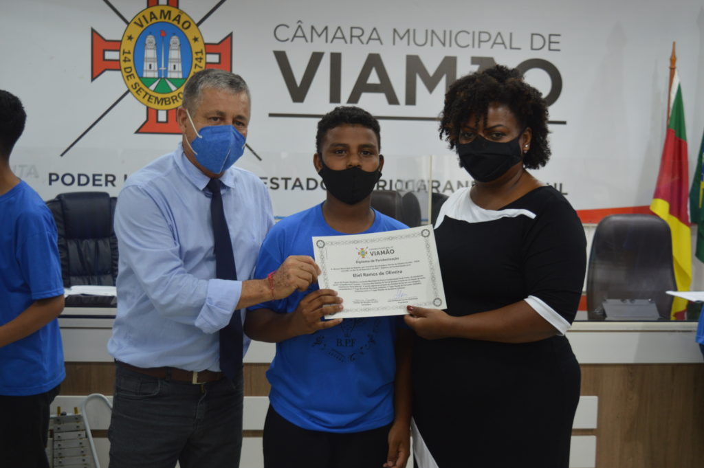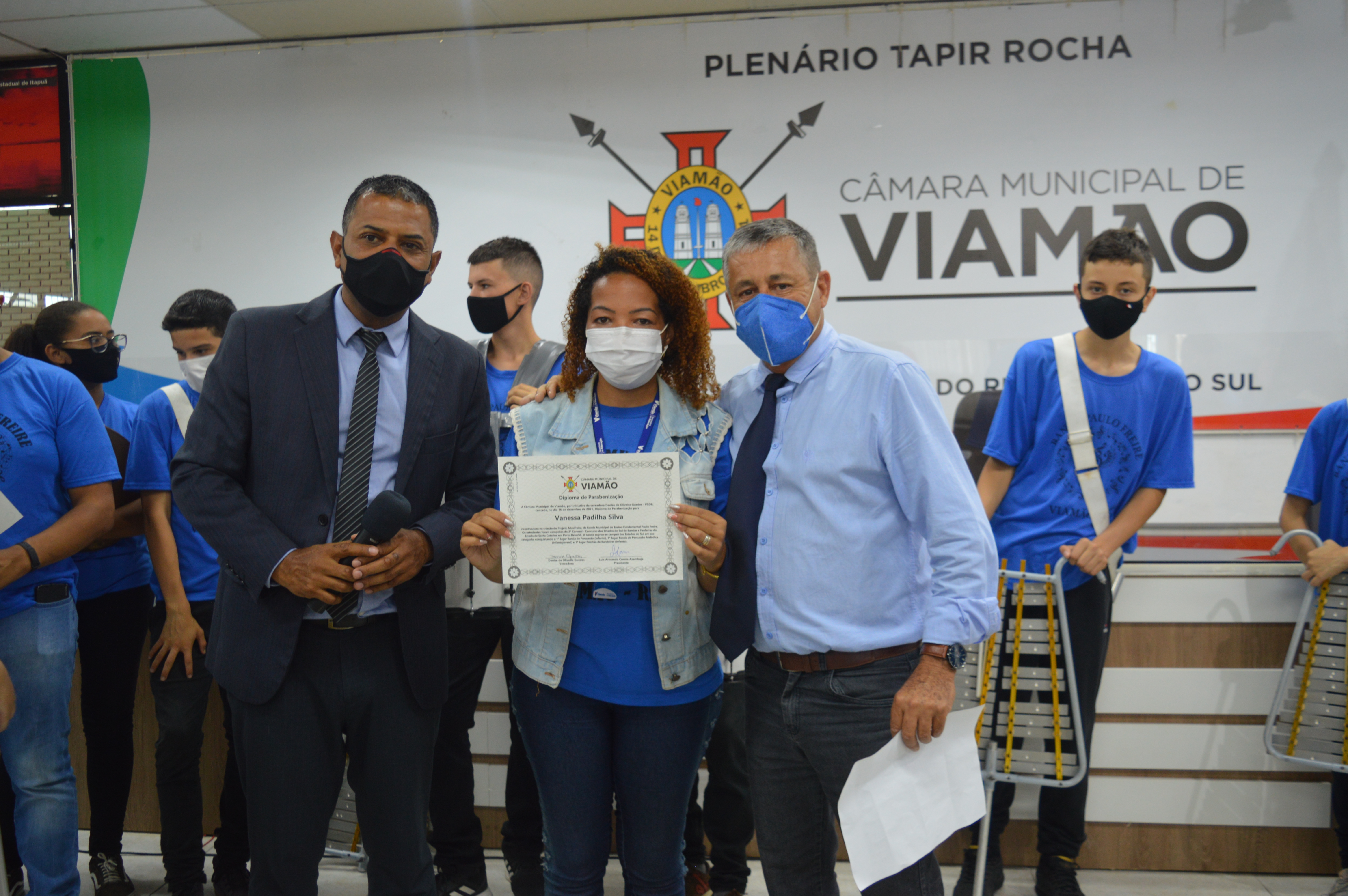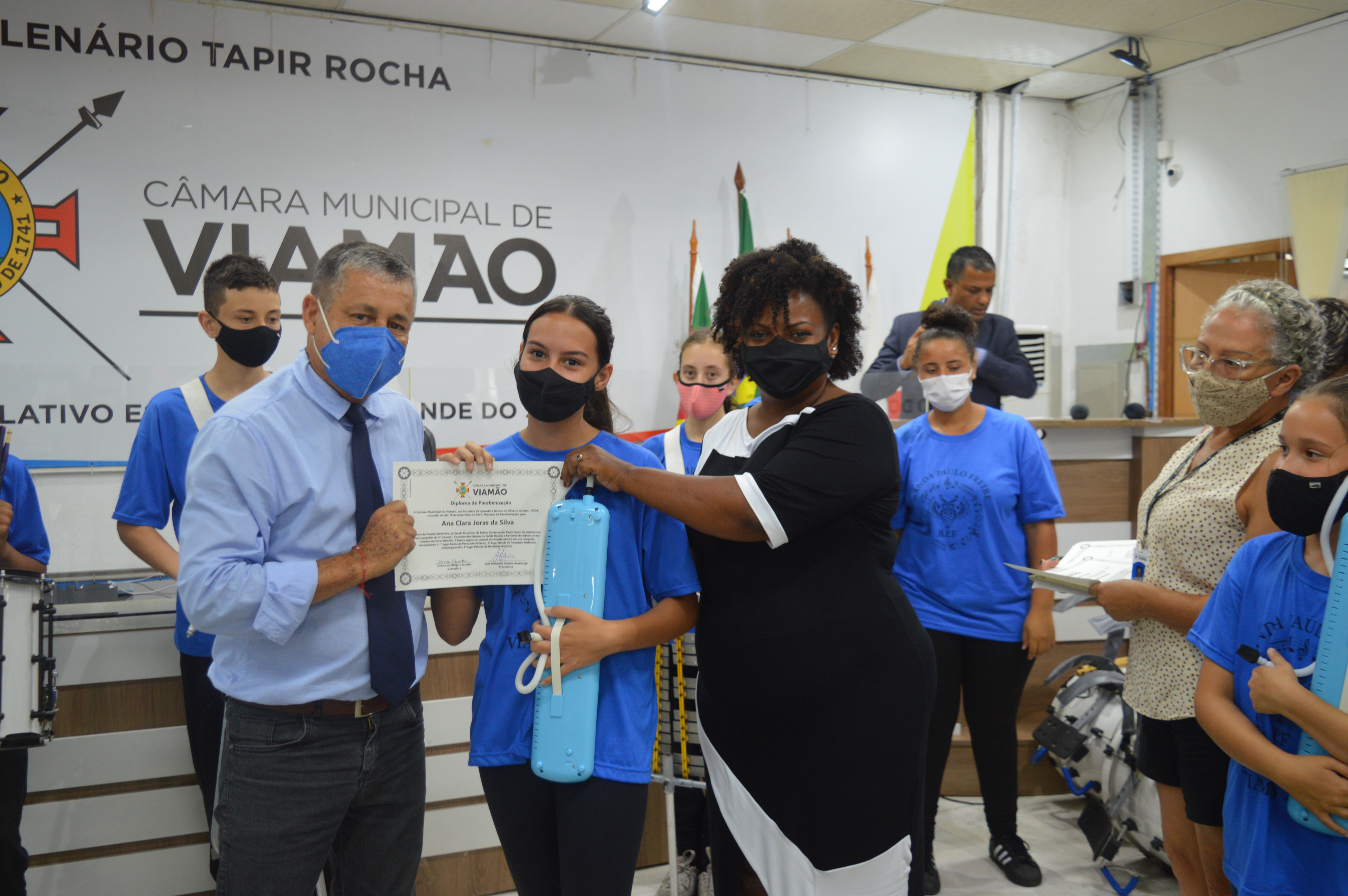A vereadora Denise Guedes – PSDB e o vereador Eraldo Roggia - PTB entregaram, na sessão plenária desta quinta-feira (16), diploma de parabenização para os alunos da Escola Municipal de Ensino Fundamental Paulo Freire, que foram campeões do 2º Conesul – Concurso dos Estados do Sul de Bandas e Fanfarras do Estado de Santa Catarina em Porto Belo/SC. A banda é campeã dos Estados do Sul em sua categoria, conquistando o 1º lugar em Banda de Percussão (infanto), 1º lugar em Banda de Percussão Melódica (infantojuvenil) e 1º lugar no Pelotão de Bandeiras (infanto).