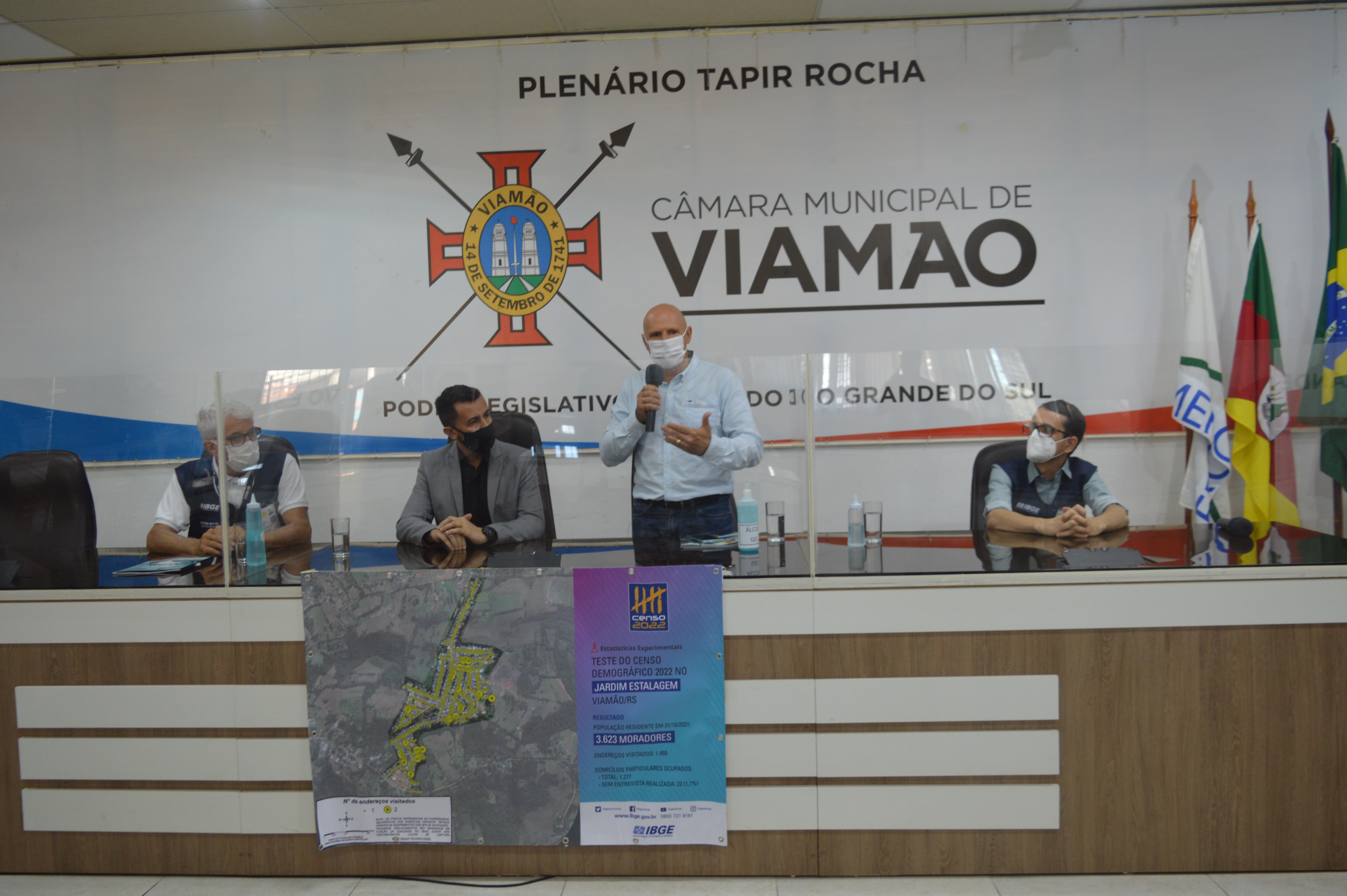 O Instituto Brasileiro de Geografia e Estatística – IBGE realizou na manhã desta quinta-feira (17), na Câmara Municipal de Viamão – CMV, o evento de lançamento dos resultados do Teste de Homologação do Censo 2022, desenvolvido com 3623 pessoas que foram recenseadas no Jardim Estalagem, em Viamão. A Mesa Diretora foi composta pelo chefe da Unidade Estadual do IBGE no Rio Grande do Sul, José Renato Braga de Almeida; pelo prefeito de Viamão, Valdir Bonatto – PSDB; pelo presidente da CMV, Prof. Igor Bernardes – PL; e pelo coordenador operacional do Censo 2022 no RS, Luís Eduardo Azevedo Puchalski. Os vereadores Markinhos da Estalagem – PSB e William Pereira – PTB também estiveram presentes no plenário Tapir Rocha.