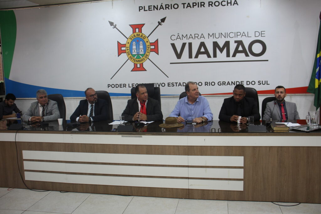 A Mesa Diretora que conduzirá os trabalhos do Legislativo viamonense neste ano tomou posse nesta quinta-feira (04), em sessão solene, na Câmara Municipal de Viamão – CMV. O ex-presidente André Gutierres – Progressistas fez a transmissão do cargo para o novo chefe do Poder Legislativo em 2024, Luisinho do Espigão - PSDB, que terá ao seu lado, na Mesa Diretora, o vereador Rodrigo Pox – PDT, como 1º vice-presidente, vereador Markinhos da Estalagem – sem partido, como 2º vice-presidente, e Prof. Igor Bernardes – PL e Kiko – MDB, respectivos 1º e 2º secretários.