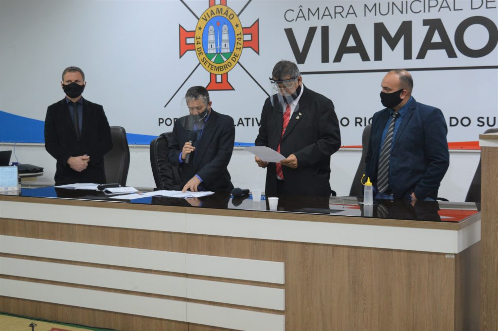 A cerimônia de posse da nova Mesa Diretora da Câmara Municipal de Viamão aconteceu em sessão extraordinária deste sábado (1), no Plenário Tapir Rocha, após a aprovação da redação final do Projeto de Resolução 006/2020, que destituiu a composição da Mesa anterior.