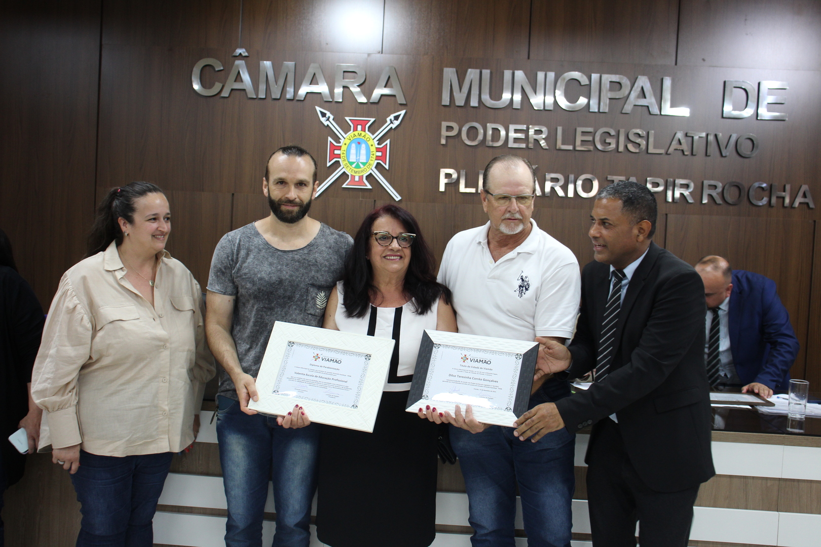 Em seu discurso de agradecimento, a professora Dilce emocionou os presentes ao relembrar sua trajetória e o apoio fundamental de sua família. “Este título não é apenas meu. É um reconhecimento ao trabalho coletivo de todos que estiveram ao meu lado ao longo desses anos. Dedico esta homenagem aos meus alunos, minha equipe, minha família e à comunidade viamonense, que sempre me acolheu com tanto carinho”, disse ela.