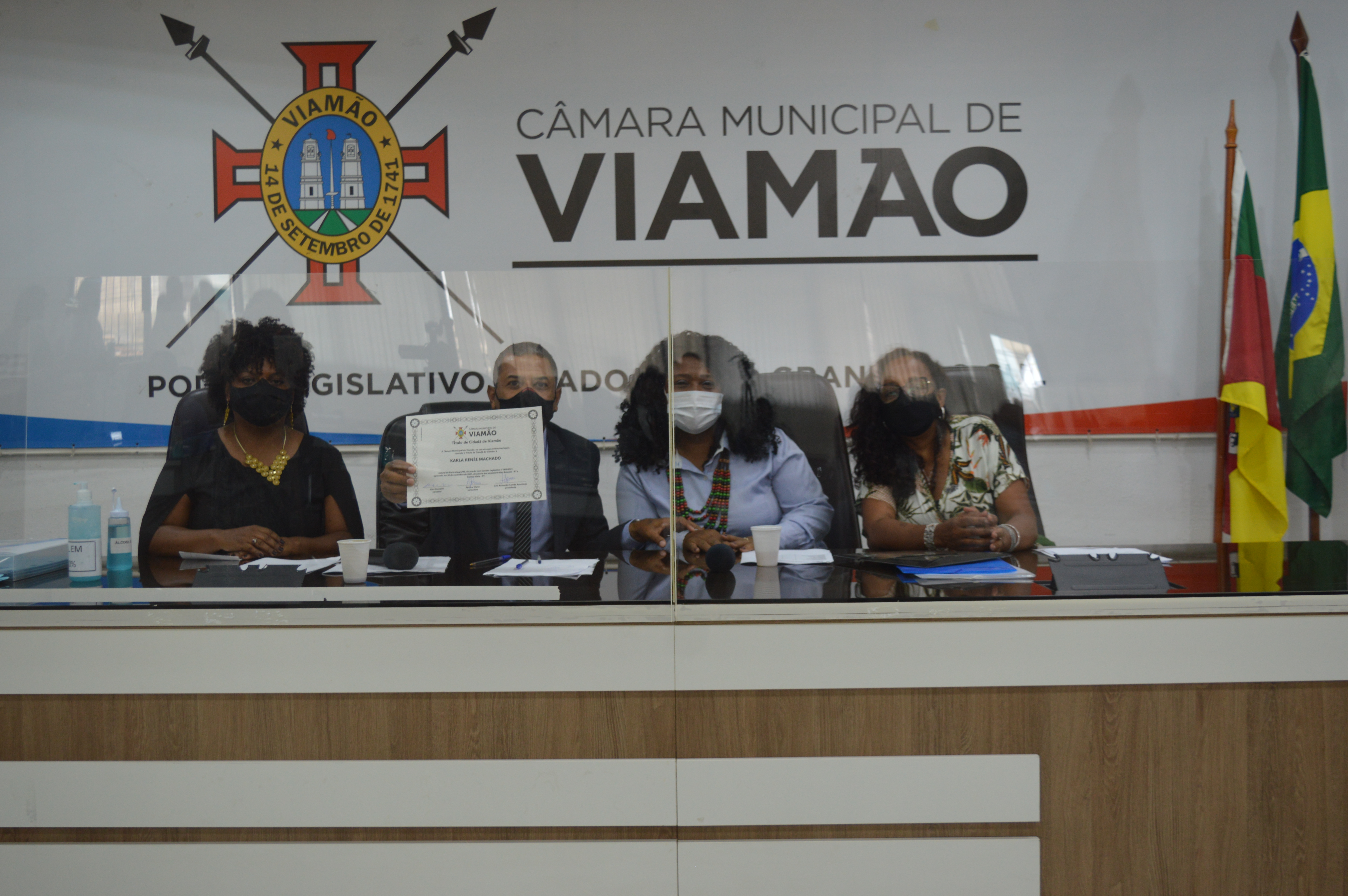 O decreto legislativo 02/2021, de autoria dos vereadores Alex Boscaini – PT e Fátima Maria – PT, concede título de cidadã viamonense à professora e sindicalista Karla Renée Machado, em honraria e reconhecimento aos relevantes trabalhos comunitários, profissionais, políticos e sociais realizados em defesa da população e, em especial, como liderança do movimento negro, no município de Viamão, com reflexos nas políticas públicas afirmativas da cidade. A entrega da honraria aconteceu na sessão plenária desta quinta-feira (02), conduzida pelo presidente Luís Armando Azambuja - PSDB, na Câmara Municipal de Viamão - CMV.