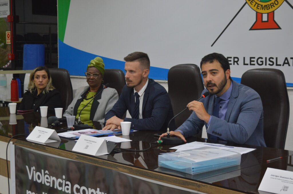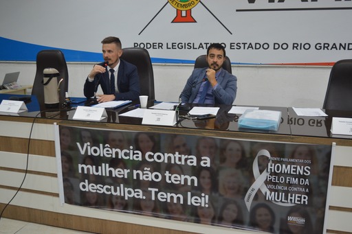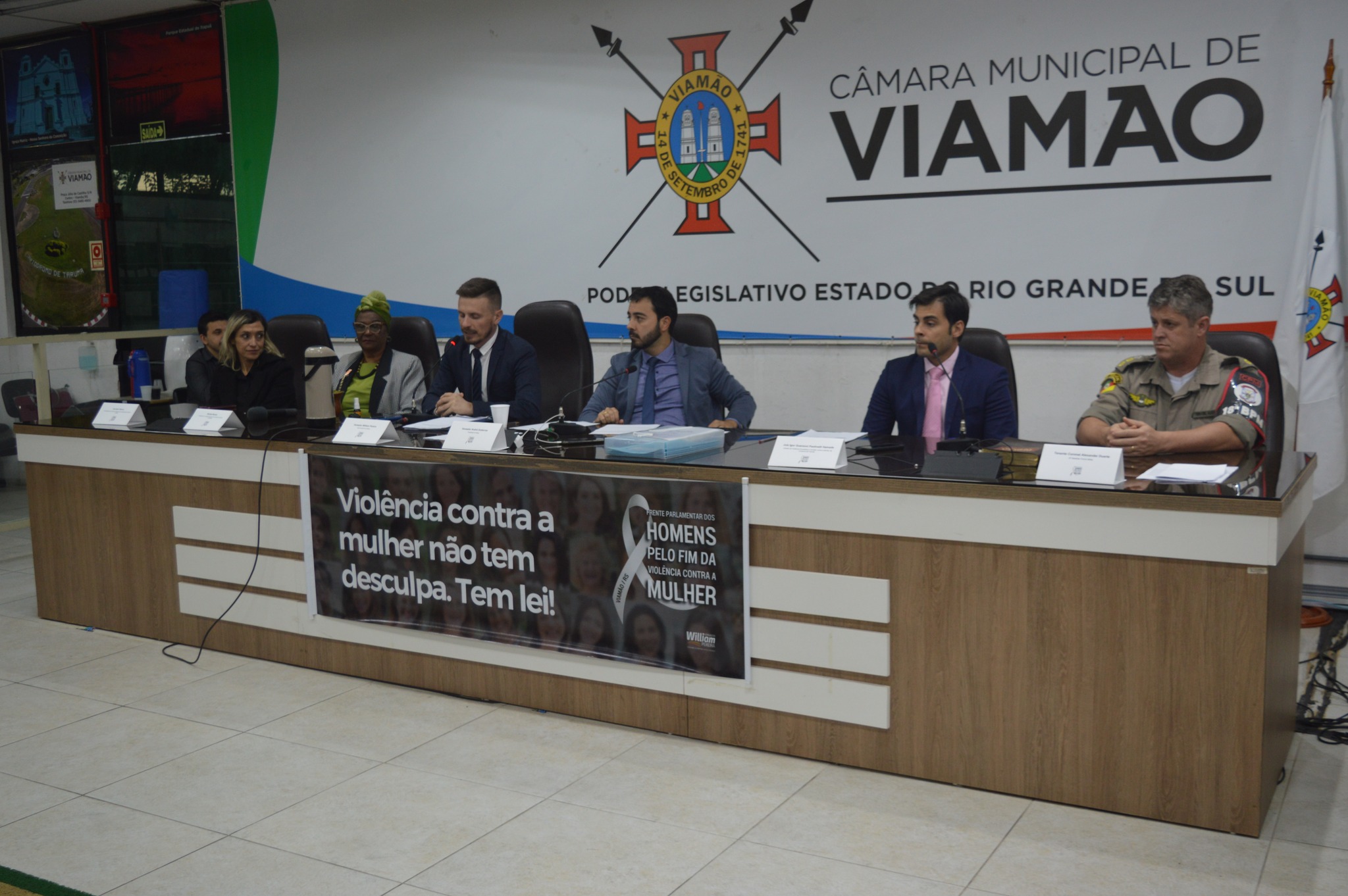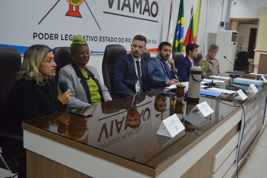 Além do presidente da Frente, estiveram presentes e compuseram a Mesa, o vereador e presidente da CMV, André Gutierres – Progressistas; a Presidente do Conselho Municipal dos Direitos da Mulher (Comdim/Viamão), Denise Nunes; a Coordenadora do Centro de Referência da Mulher (CRM), Ana Maria Oliveira; o Tenente Coronel Alexander Duarte, Comandante do 18º Batalhão da Brigada Militar e o Juiz Igor Guerzoni Hamade, responsável pelo Juizado da Violência Doméstica e Familiar contra a Mulher na Comarca de Viamão.