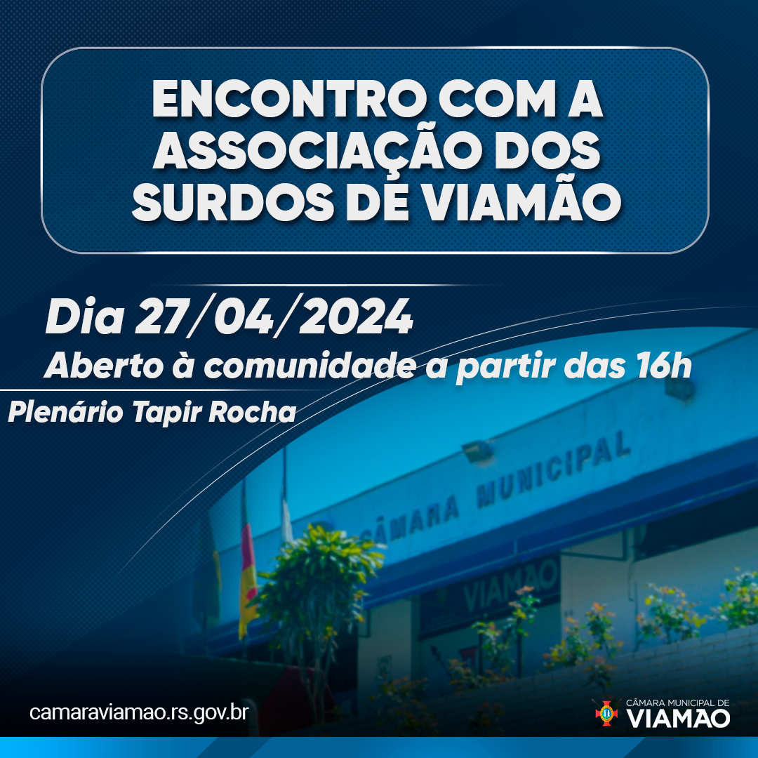 O encontro mensal da diretoria da Associação dos Surdos de Viamão acontecerá no próximo sábado (27), na Câmara Municipal de Viamão – CMV, a partir das 15h. O evento estará aberto à comunidade surda a partir das 16h. O objetivo é possibilitar o debate construtivo em favor da inclusão social e do atendimento das demandas expostas pela comunidade surda, gerando mais qualidade de vida a esta população.