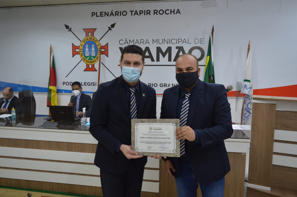 O vereador Rodrigo Pox – PDT entregou diploma de parabenização para o Sindicato Médico do Rio Grande do Sul – SIMERS, que completa hoje 90 anos, destacando-se na busca por direitos da categoria médica. A homenagem aconteceu na sessão plenária desta quinta-feira (20), na Câmara Municipal de Viamão – CMV.