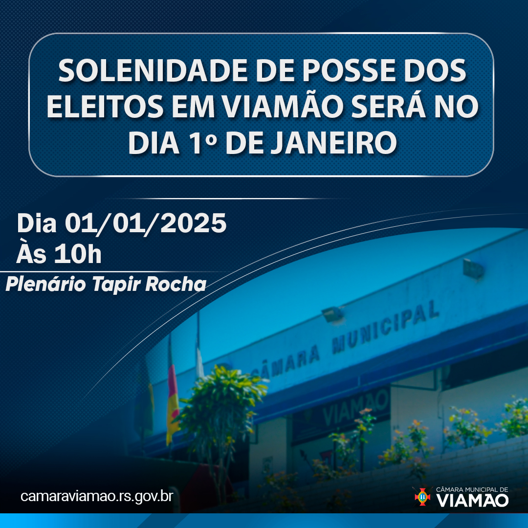 Na quarta-feira de Ano Novo, dia 1º de janeiro de 2025, às 10h, os 21 vereadores eleitos no município vão tomar posse na Câmara Municipal de Viamão – CMV para a 19ª Legislatura. Sequencialmente, haverá eleição da Mesa Diretora que conduzirá os trabalhos da Casa Legislativa no próximo ano. A posse do prefeito e do vice-prefeito também acontecerá no plenário Tapir Rocha.