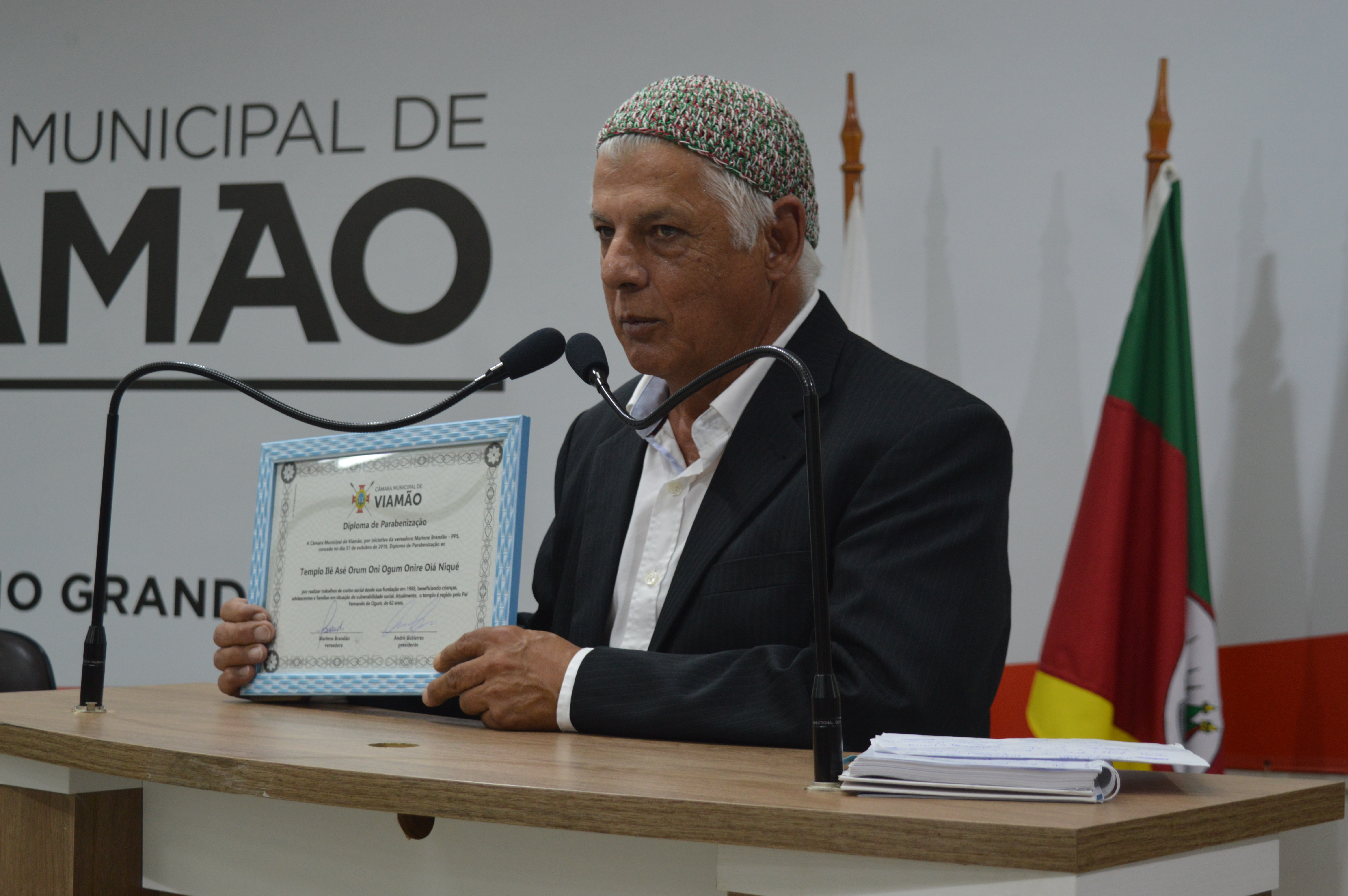 A vereadora suplente Marlene Brandão – PPS prestou homenagem para o Templo Religioso Ilê Asé Orum Oni Ogum Onirê Oiá Niqué e seu babalorixá Pai Fernando de Ogum. A entrega do diploma de parabenização aconteceu na sessão desta quinta-feira (31), na Câmara Municipal de Viamão – CMV.