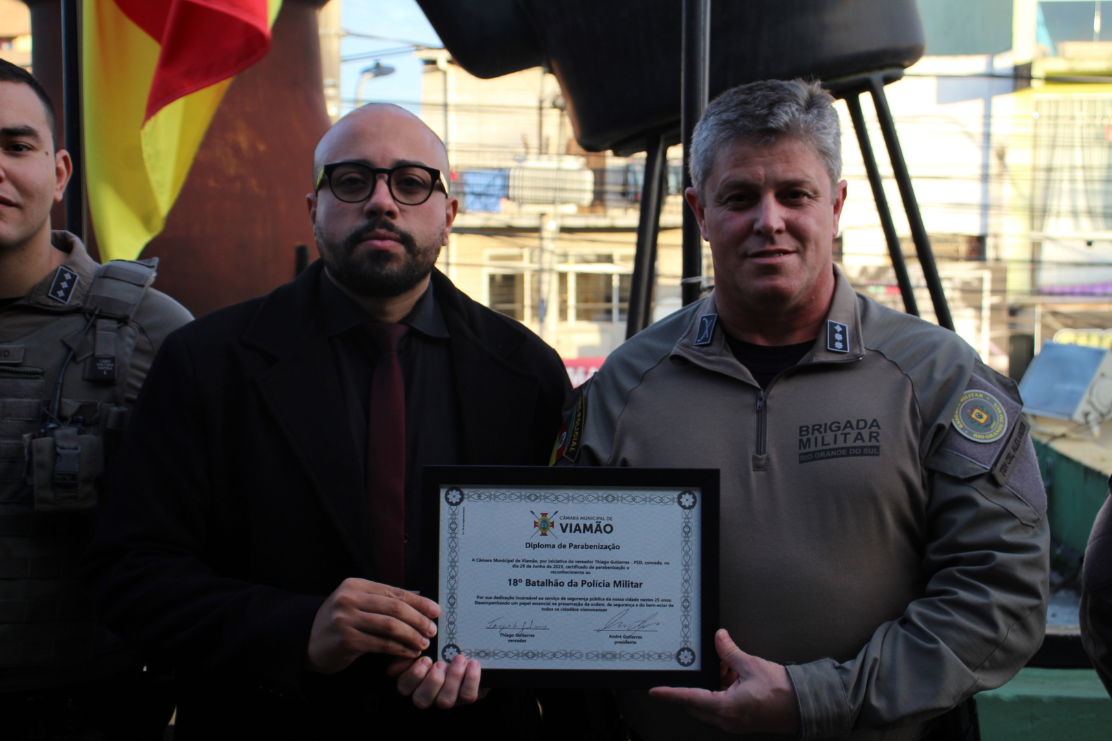Na sessão plenária desta quinta-feira (29), o vereador Thiago Gutierres- PSD entregou diploma de parabenização ao 18º Batalhão da Polícia Militar por seu aniversário de 25 anos na cidade de Viamão, desempenhando um papel essencial na preservação da ordem, segurança e do bem- estar de todos os cidadãos viamonenses.