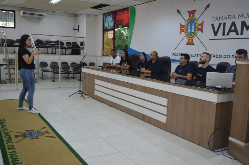 Na manhã desta segunda-feira (25), o vereador Thiago Gutierres - PSD promoveu uma aula de Língua Brasileira de Sinais - Libras, no plenário Tapir Rocha, destinada ao treinamento de sua equipe de gabinete para o atendimento à população surda da cidade. A aula foi ministrada pela intérprete e professora de Libras Camila Corcini, que acompanha o vereador nas sessões da Câmara Municipal de Viamão – CMV com o intuito de proporcionar acessibilidade.