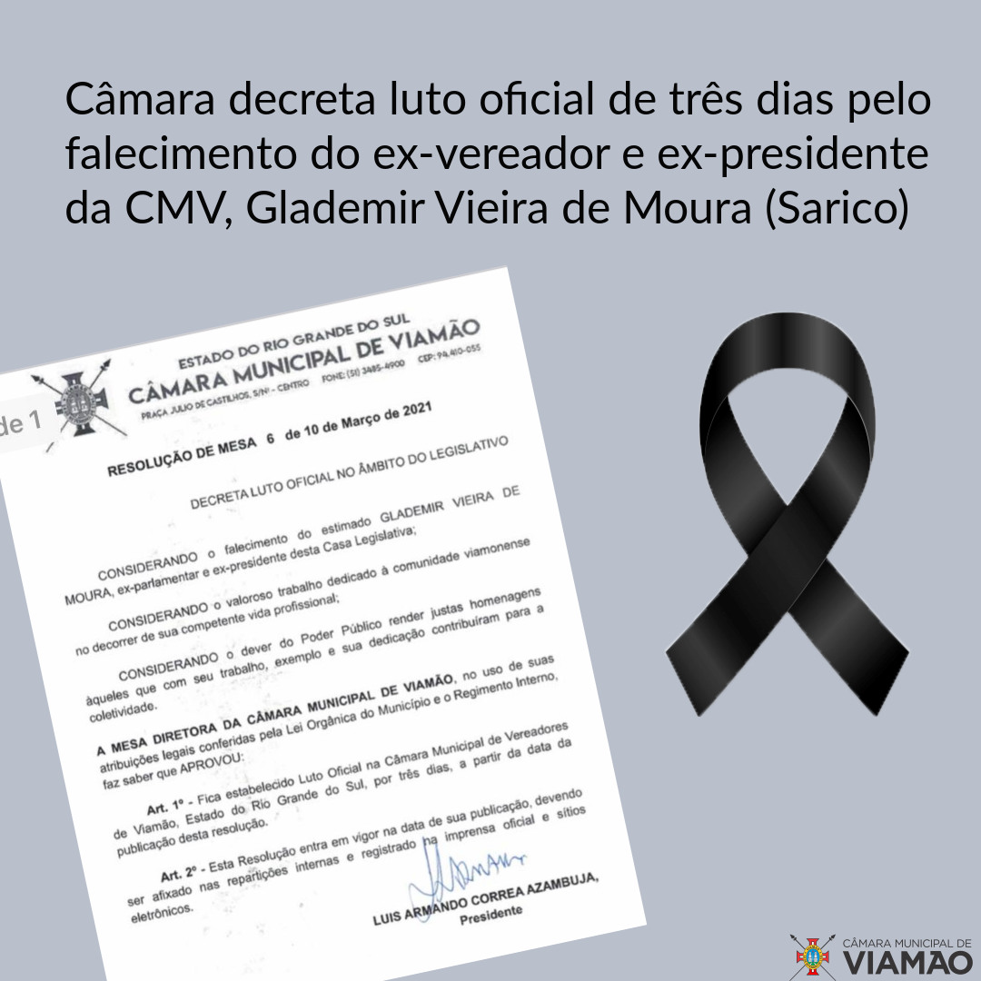 • Câmara de Viamão decreta luto oficial de três dias pelo falecimento do ex-presidente do Legislativo Glademir Vieira de Moura (Sarico)